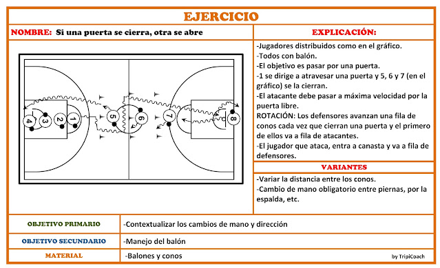 Traigo aquí un nuevo ejercicio de toma de decisiones sencillo pero eficaz. Ejercicio muy útil en la iniciación para acostumbrar al jugador con balón a no mirarlo y saber "castigar" a la defensa en función de cómo reaccione esta.